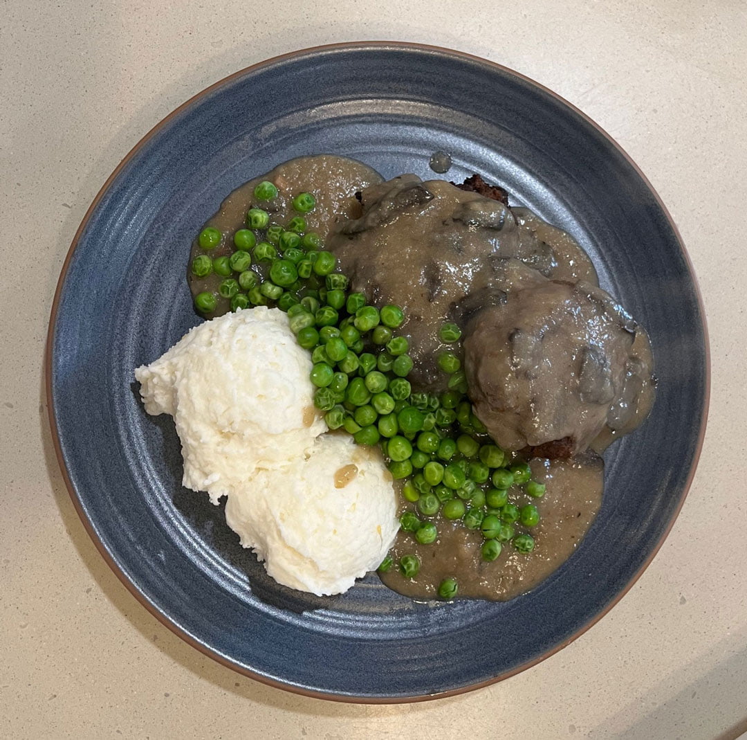 Salisbury Steak in Mushroom Gravy, Mashed Potatoes & Peas